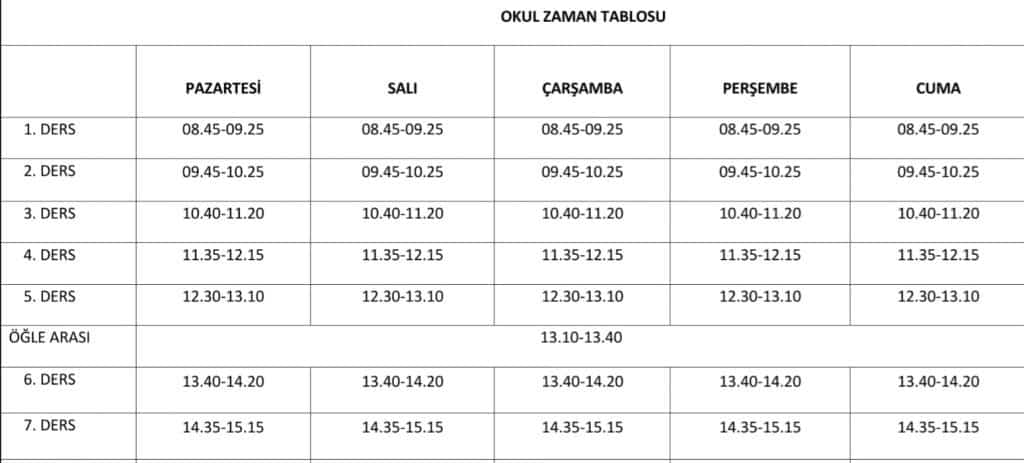2025-2026 Eğitim Öğretim Yılı Okul Ders Giriş-Çıkış Saatlerimiz
